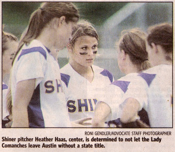 Shiner pitcher Heather Haas, center, is determined to not let the Lady Comanches leave Austin without a state title. photo by Roni Gendler, Advocate Staff Photographer