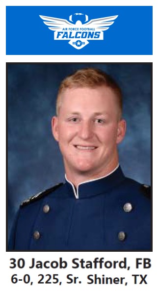 Shiner grad and Air Force Academy fullback Jacob Stafford has seen action in several games so far this season for the Falcons. View Comments Jacob Stafford doesn’t need your blazing speed, thank you very much.