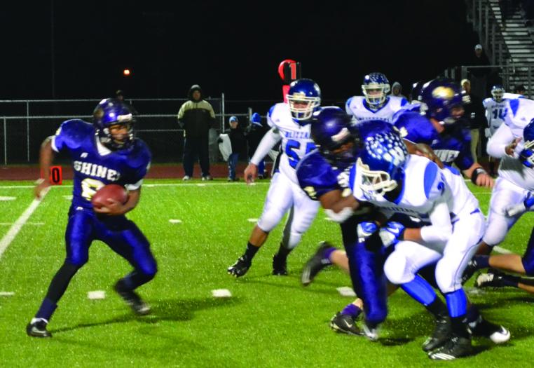 Shiner running back Marlon Wallace (8) looks for running room behind a fine block by Caleb Curtis (22) in last Saturday's playoff game vs. Winters in Marble Falls. photo by Mark Lube, Gonzales Cannon