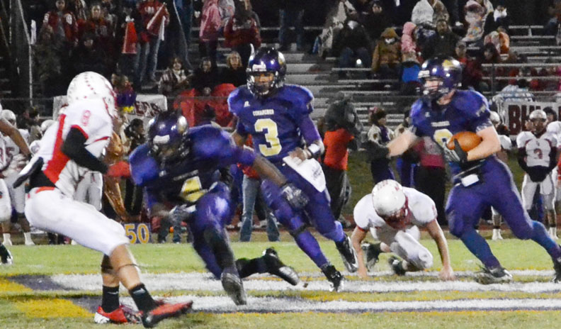 The Bulldogs then marched 75 yards in 12 plays. Fullback Tyler Bullard picked up 27 yards on an inside handoff to the Comanche 48 and running back Wesley Guzeman had a 16-yard rush on the toss play. Later, Three Rivers had a fourth- and-2 at the 13 and converted with a Guzeman sweep play. A few plays down the line, it was fourth-and-2, and the ‘Dogs did the same thing -- toss play to Guzman for the score. However, the two-point conversion to tie the game was not made.