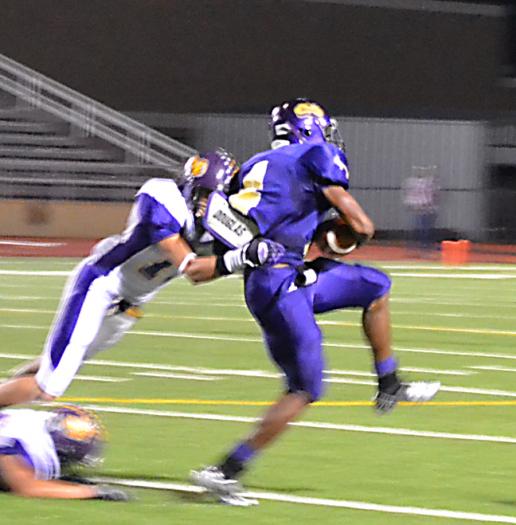 Brian Kloesel tries to prevent Weimar quarterback Juwan Almeida from wriggling out of his tackle.