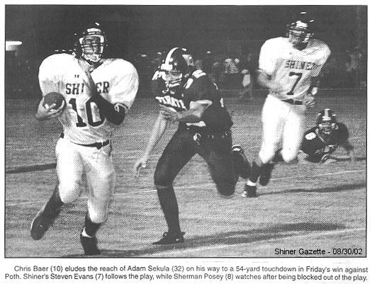 Shiner was forced to punt and Poth took over on their 26. Two first downs and three minutes later Jason Weed broke loose and scored on a 38-yard run. Weed added the extra point and knotted the score at 7-7 with 1:35 left in in the first quarter. The second period was a defensive battle with both teams punting three times.