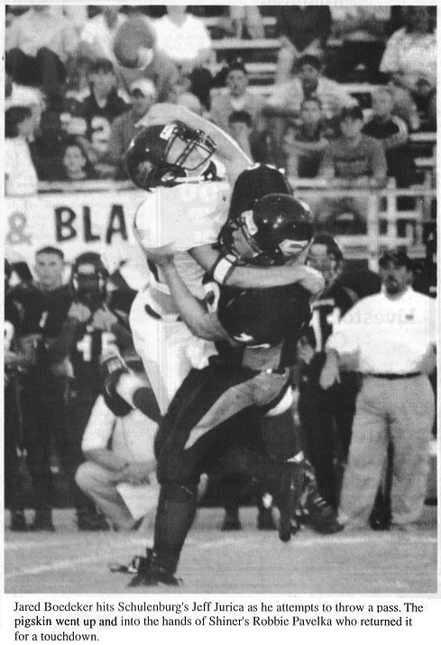 Eric Grosenbacher intercepted a pass to stop a Schulenburg threat on the Shiner 16-yard line with 4:01 left on the first quarter clock.