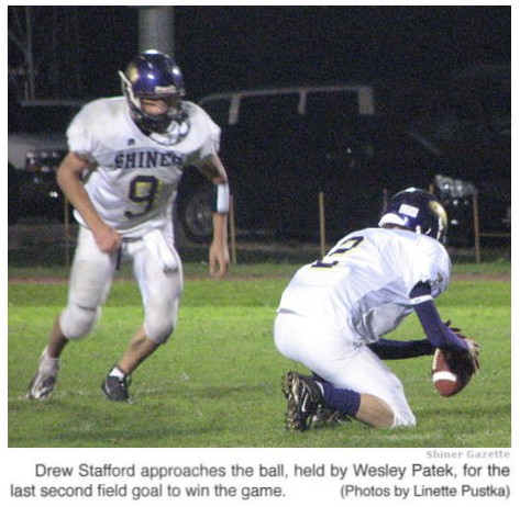 Shiner started their final possession on their 33 and had little time to cover the 67 yards to pay dirt. Stafford completed a pass to Josh Greathouse for 10 yards and then on fourth down he hit Curtis Shields for a 12-yard gain to the Louise 41. Greathouse picked up two more yards but a penalty set the Comanches back to the 44-yard line. Stafford completed a pass to Shields to the 29 and with just :03 seconds left, Stafford booted the winning field goal.