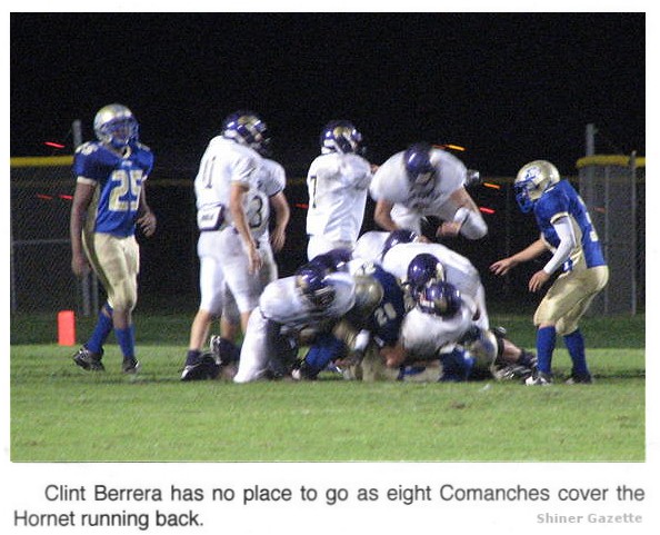 Clint Berrera has no place to go as eight Comanches cover the Hornet running back.