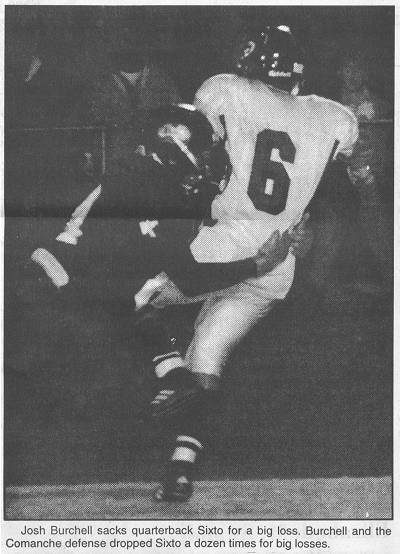 Beaver quarterback, B.J. Sixto, who leads the area in the passing department with 101 completions was sacked 11 times and had to contend with one or more Comanches in his backfield most of the night.