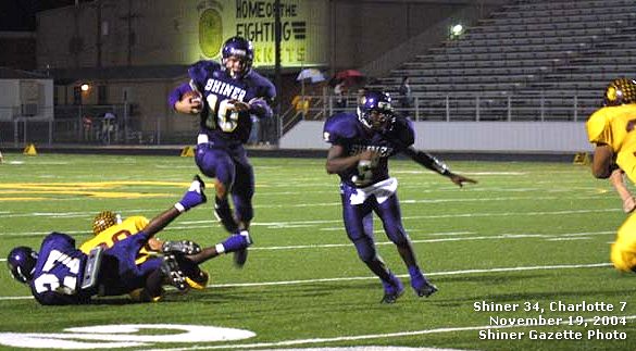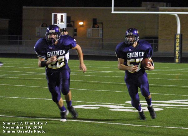 While the Shiner defensive line kept Charlotte's running game in check, the Shiner secondary intercepted two passes and broke up numerous others to stymie the Trojan air attack.