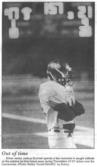 Shiner senior Joshua Burchell spends a few moments in sought solitude on the sideline as time ticked away during Thorndale's 47-27 victory over the Comanches.