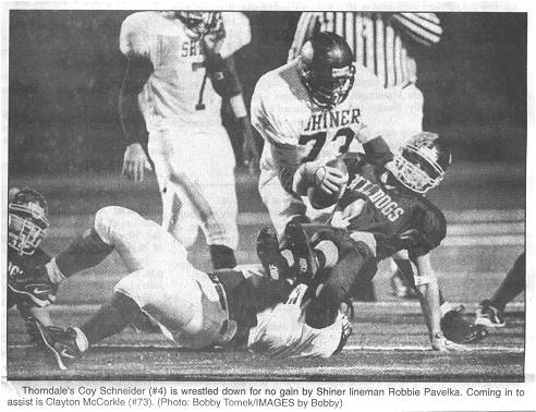 Thorndale then drove 53 yards, capping the drive with a 29-yard run by Schneider. The PAT was no good. Shiner fumbled the kick off and the Bulldogs recovered on their 39.