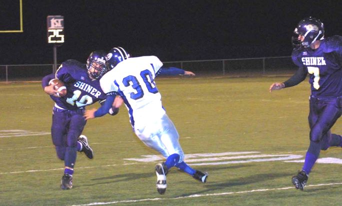 Shiner running back Chris Baer (10) makes a move around the end against a Falls City defender assisted by Steven Evans (7).