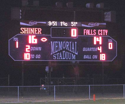 The Victoria Memorial scoreboard testifies to Shiner's victory over Falls City on Friday night.
