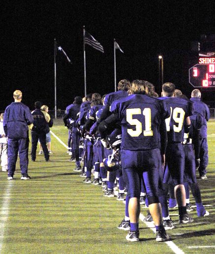A view of the Shiner sideline as the Star Spangled Banner is played by the Shiner High School Marching Band before kickoff.