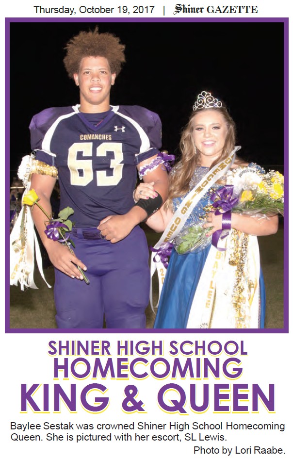 Baylee Sestak was crowned Shiner High School Homecoming Queen. She is pictured with her escort, SL Lewis.