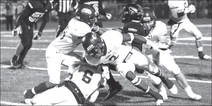 Makylin Burchell, Drew Wenske, Dalton Brooks and AJ Patek gang tackle a Schulenburg ball carrier Friday night in Hallettsville. photo by Ralph Raabe / Photos by Lori Raabe