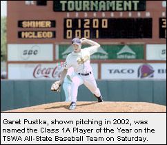 Garet Pustka, shown pitching in 2002, was named the Class 1A Player of the Year on the TSWA All-State Baseball Team on Saturday. photo by Victoria Advocate