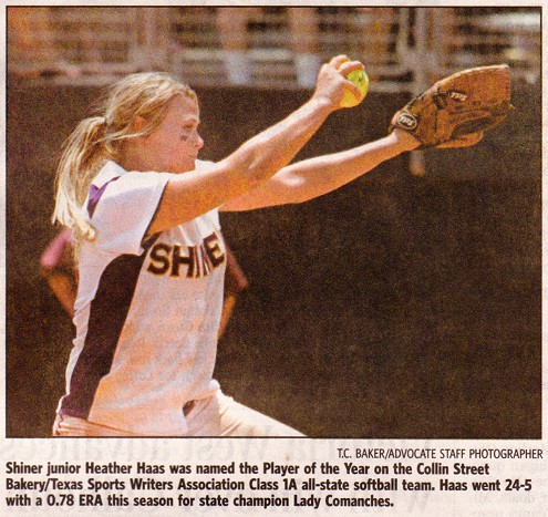 Haas, who led the Lady Comanches to the Class 1A state title, was named Player of the Year on the Collin Street Bakery/Texas Sports Writers Association Class 1A all-state softball team released this week.