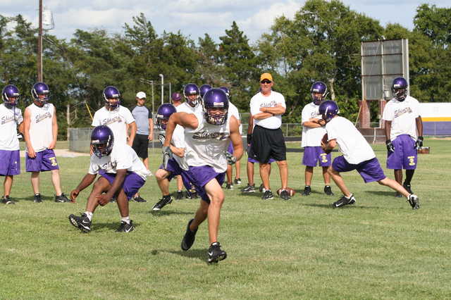 Shiner defensive coordinator Billy Turek, right-center, runs players through drills during practice on Thursday.