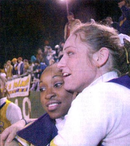 Shiner cheerleaders Brianna Evans, left, and Macie Schaefer hug as the final seconds