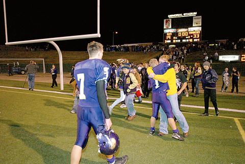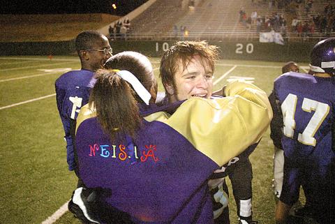 Shiner's Chase O'Connor gets a hug from a cheerleader moments after the