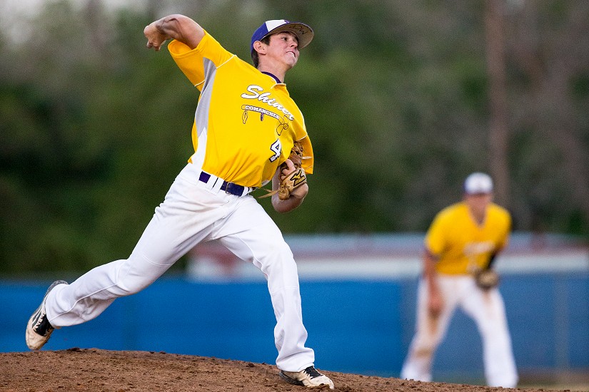 Shiner's Blake Michalec pitches agianst St. Joseph during Monday's game at Riverside Stadium.