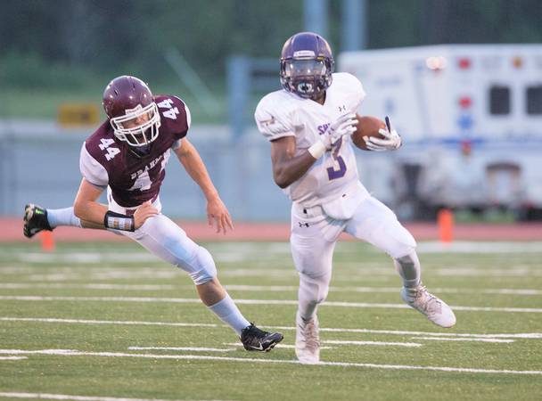 Hallettsville's Jaxon Reeves runs after Shiner's Dadrian Taylor during Friday's football game at Brahma Memorial Stadium.