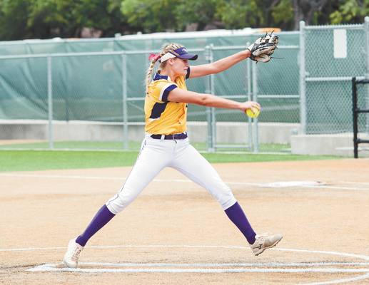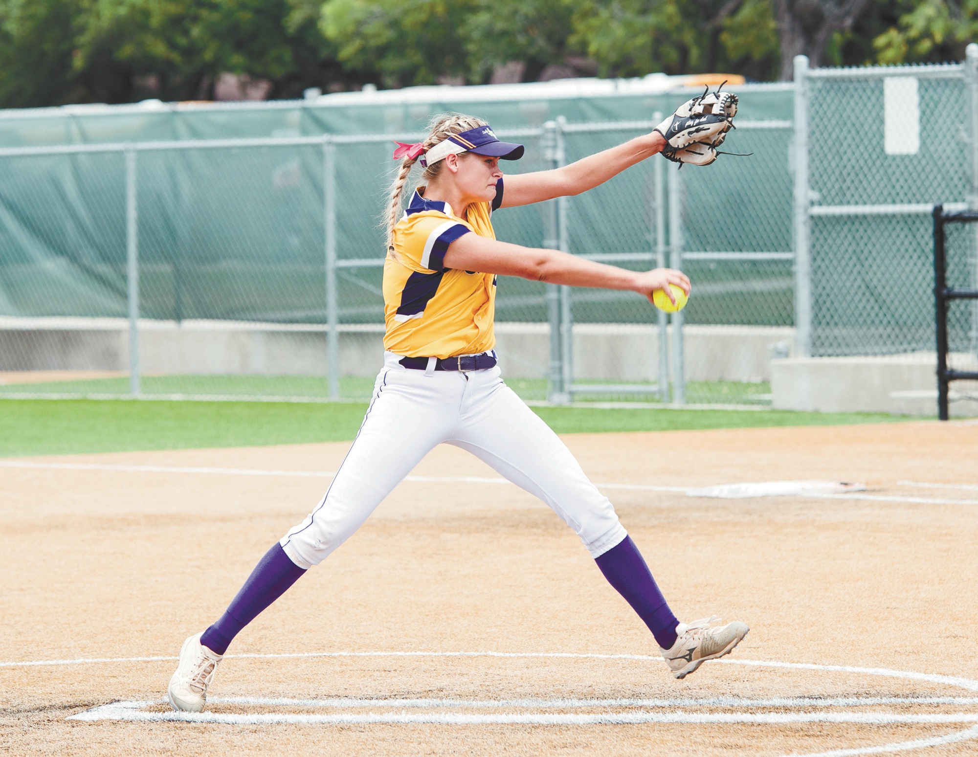 Shiner's Lauren Haas pitches against Riviera Kaufer during Game 2 of their
