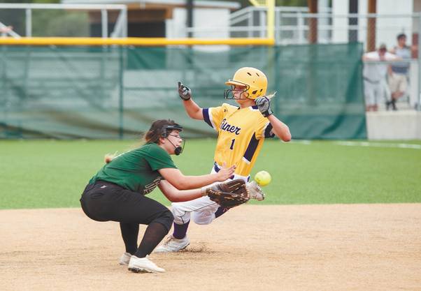 Shiner's Mackinly Pilat attempts to slide past Riviera Kaufer during Game 2