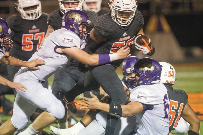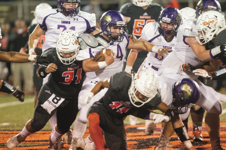 Refugio's Daryon Ramirez is brought down by Shiner during Friday night's District 15-2A, Division I game.