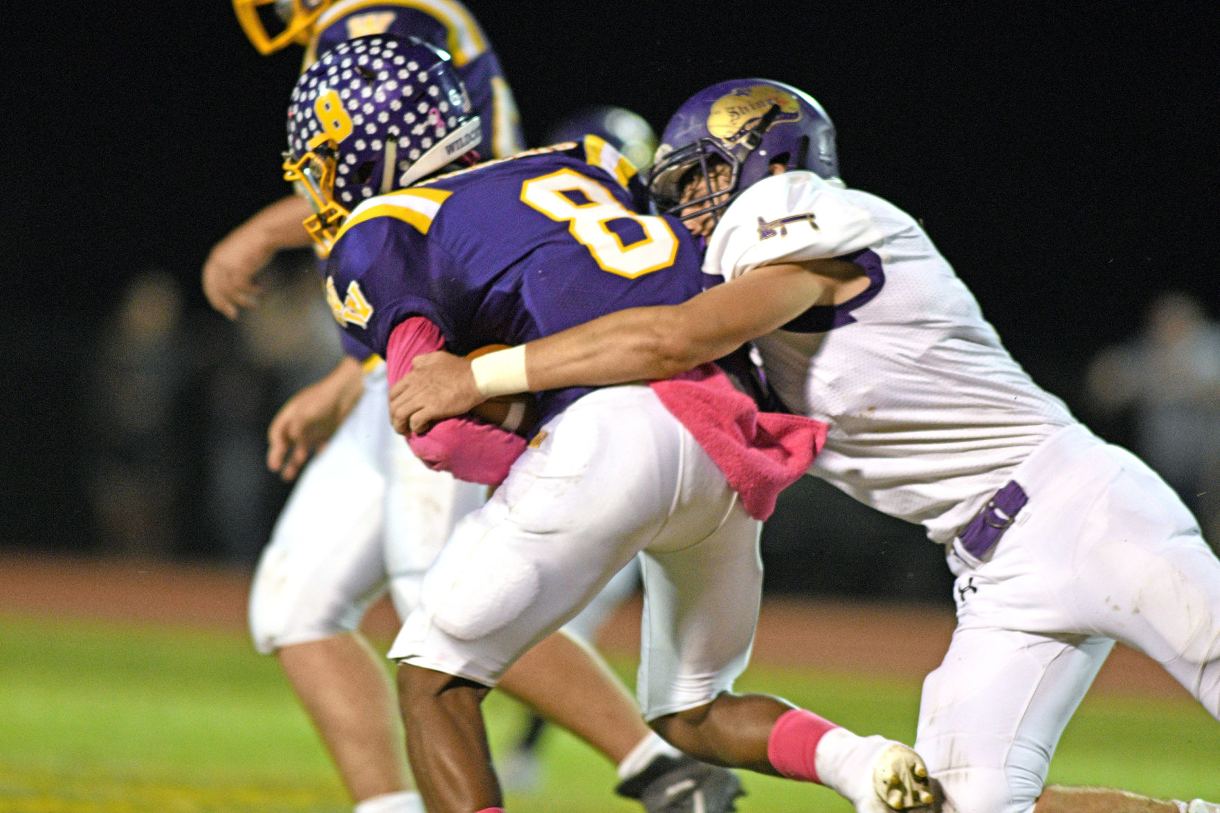 Weimar’s Dylerick Ellison is stopped by a Shiner defender for a short gain during Friday’s District 15-2A, Division I game in Weimar.